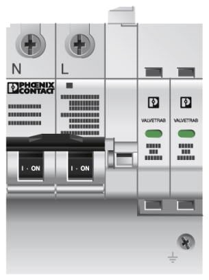 Комбинация из УЗИП класса II и входного предохранителя, с контролем разрядника и предохранителя, с контактом для дистанционной индикации. Исполнение: 3-проводные системы (L1, N, PE), монтаж на рейку NS 35