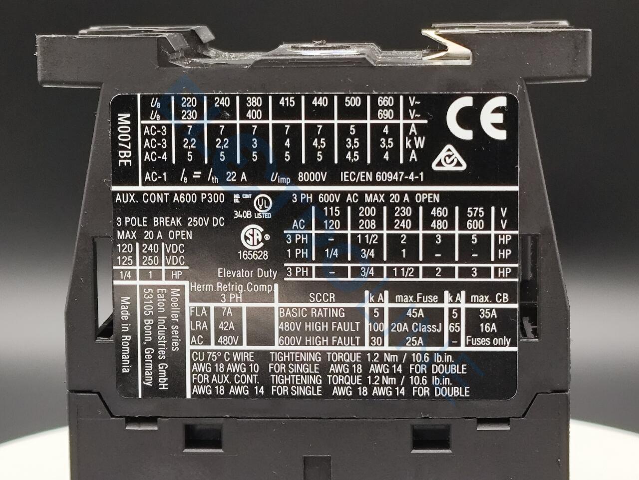 | Ном. характеристики специального назначенияНом. характеристики определенного назначения (100 000 циклов согл. UL 1995)FLA 480В 60Гц 3-фазн. | 7 A |