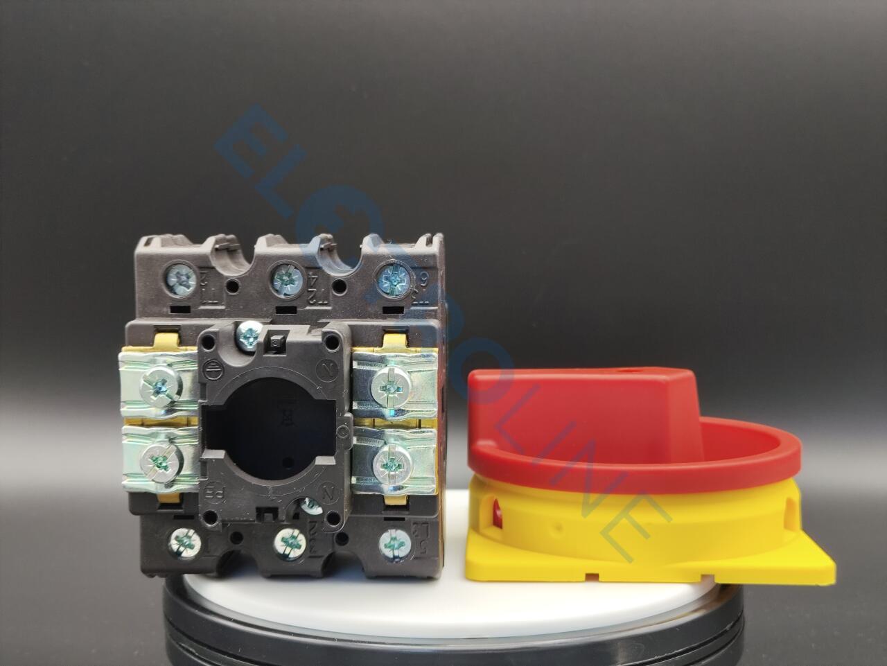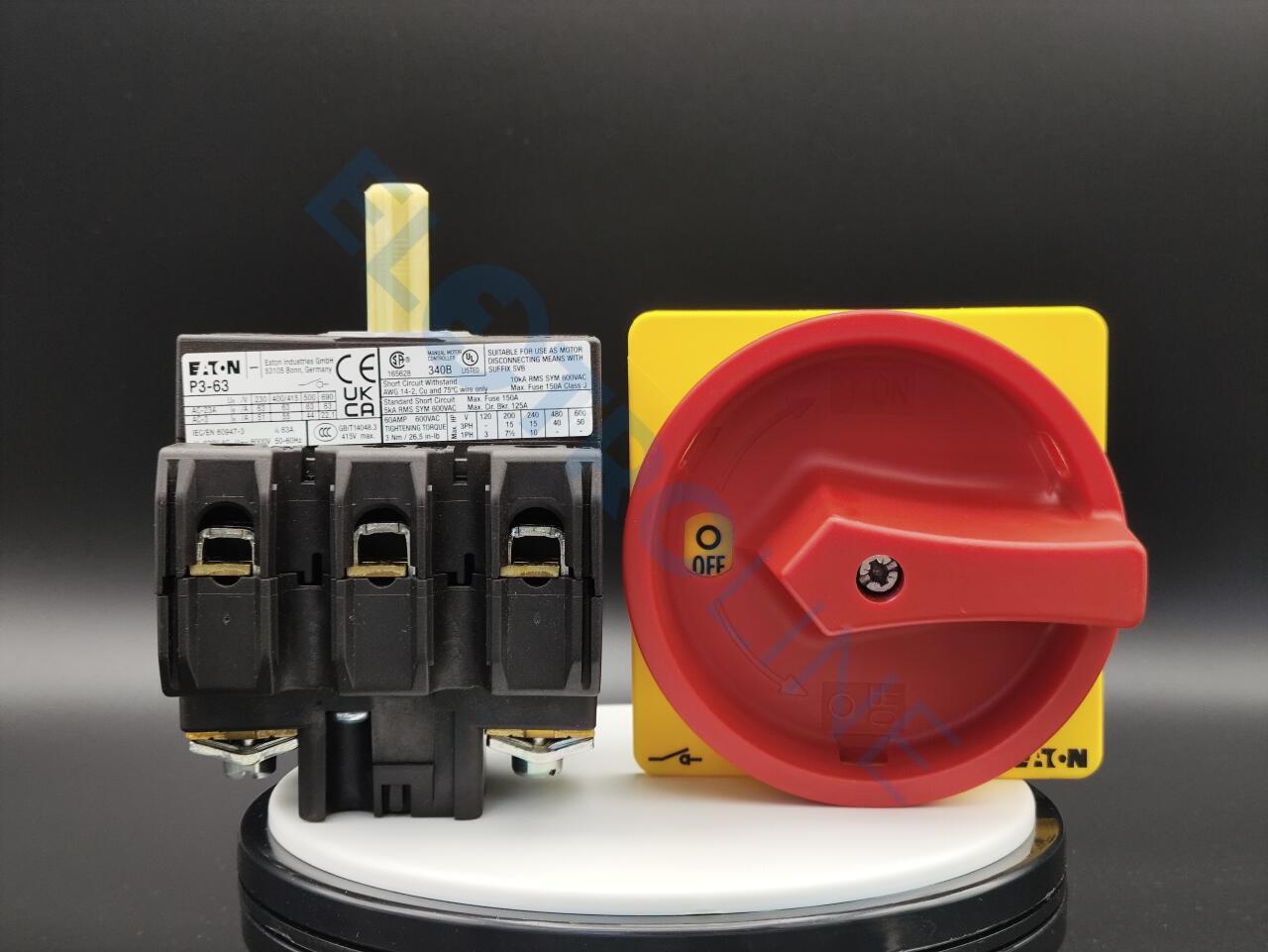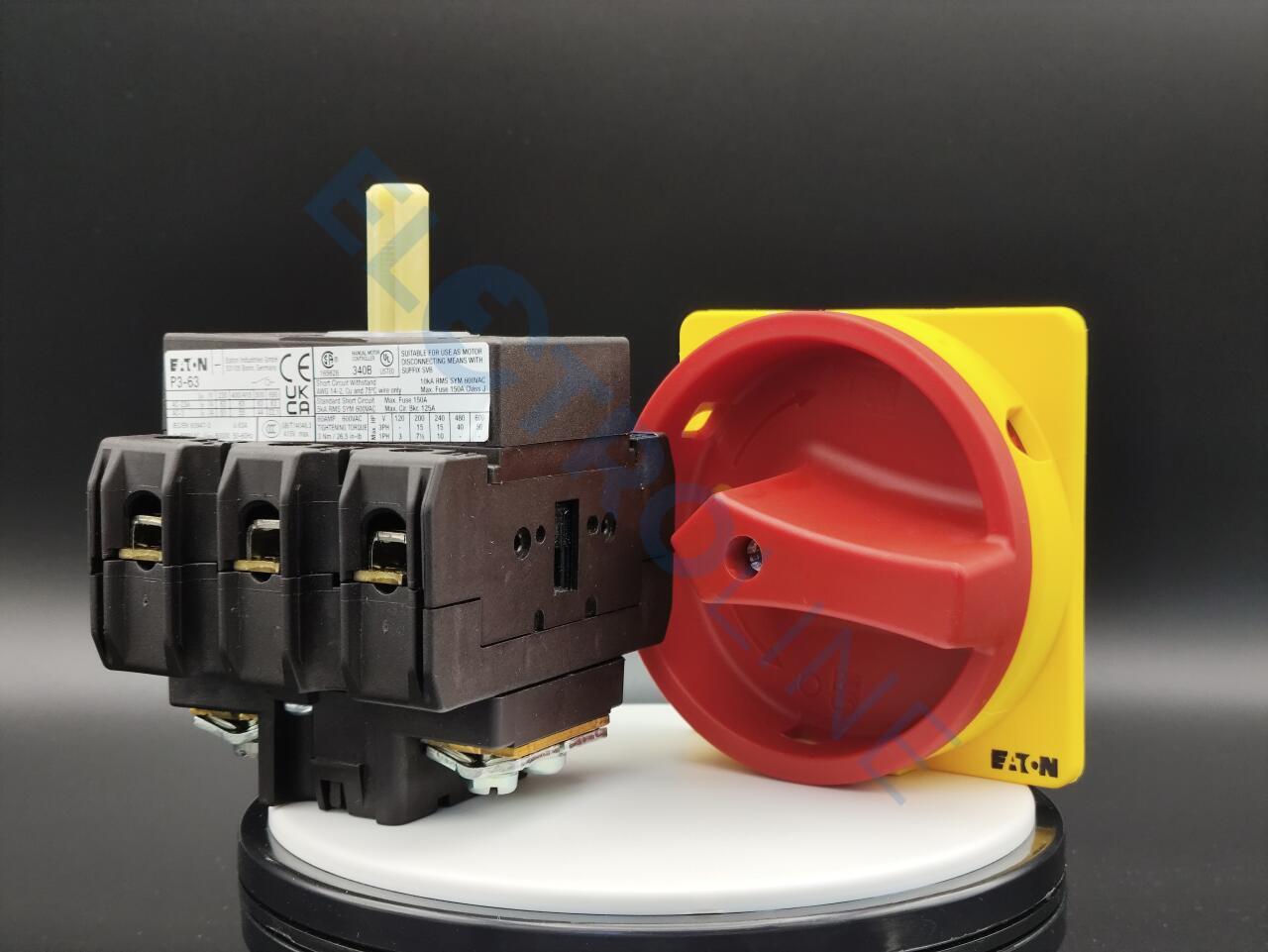Главный выключатель, Ассортимент: Главные выключатели, Сервисные выключатели, Ремонтные выключатели, Идентификатор типа: P3, Функция останова: Функция аварийного выключения, с красной поворотной ручкой и с желтым храповым венцом, Информация о комплекте поставки: Возможна дополнительная установка вспомогательного контакта или нулевого провода., 3-полюсн., Возможность блокировки: запираемый в положении 0, Класс защиты: спереди IP65, Конструктивное исполнение: Монтаж, Расчетная эксплуатационная мощность AC-23A, 50 - 60 Гц 400 В: P = 30 кВт, измеренный ток длительной нагрузки: Iu = 63 A, Стандарты и предписания: IEC/EN 60947, VDE 0660, IEC/EN 60204, CSA, UL, Силовые разъединители согласно IEC/EN 60947-3, NEMA12